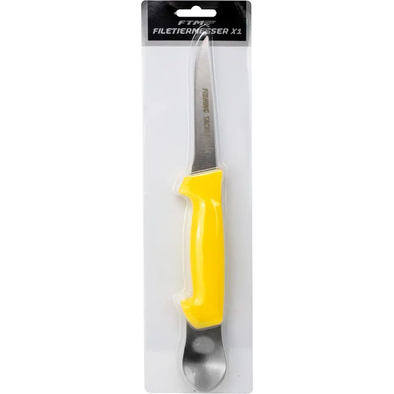 Das Filetiermesser X1 von FTM ist mit einer 12cm langen, scharfen Klinge und einem rutschfesten Kunststoffgriff ausgestattet. Der Griff verringert durch seine Form die Verletzungsgefahr beim Gebrauch dieses Messers. Als Besonderheit verfügt das Messer am Ende des Griffes über einen stabilen Löffel zum Entfernen der Niere des Fisches. Dank dieser praktischen Funktion ist dieses Messer nicht nur gut zum Filetieren sondern auch als Ausnehmmesser geeignet. Somit ist das Filetiermesser X1 ideal für alle Angler.