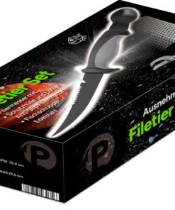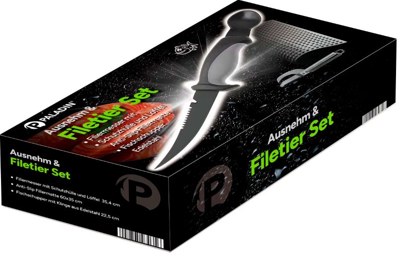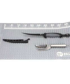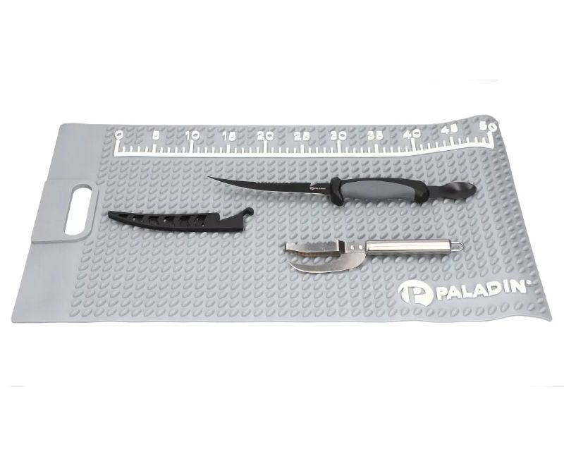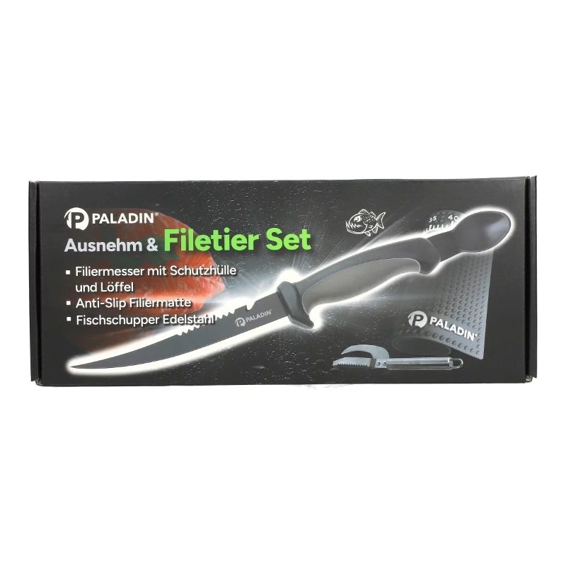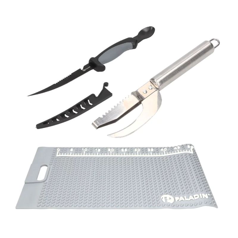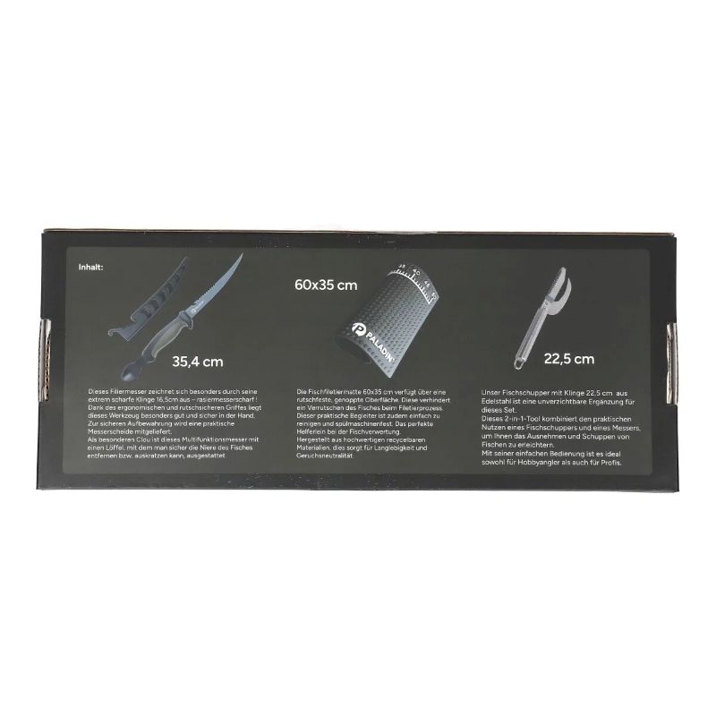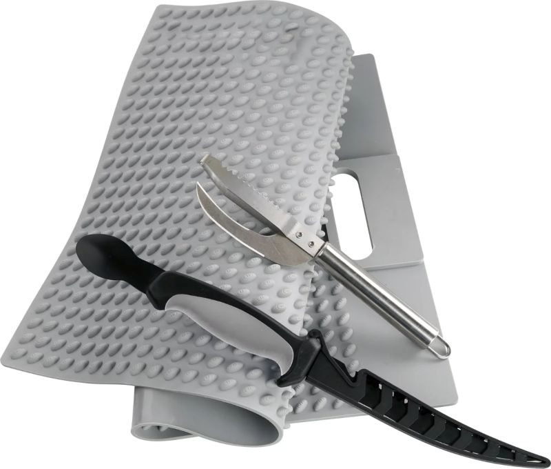 Hier kann der Fang perfekt verarbeitet werden, das praktische Filiermesser mit Auskratzer sowie der Fischschupper mit Klinge bilden das ultimative Werkzeug. Die Matte verhindert ein Verrutschen der Fische.